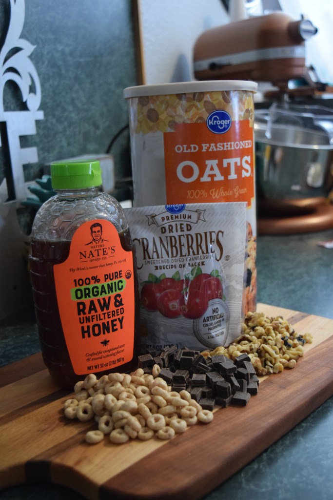 All you’ll need is old fashioned oat, cheerios (we used honey cheerios), a nut of your choice (we used walnuts), dark chocolate, and honey. Prep time is about 10 minutes. Baking takes 25-30 minutes, and allowing for cooling time this project took us about an hour to finish.