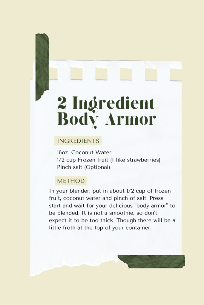 In your blender, put in about 1/2 cup of frozen fruit, coconut water, and a pinch of salt. Press start and wait for your delicious “body armor” to be blended. It is not a smoothie, so don’t expect it to be too thick. Though there will be a little froth at the top of your container.