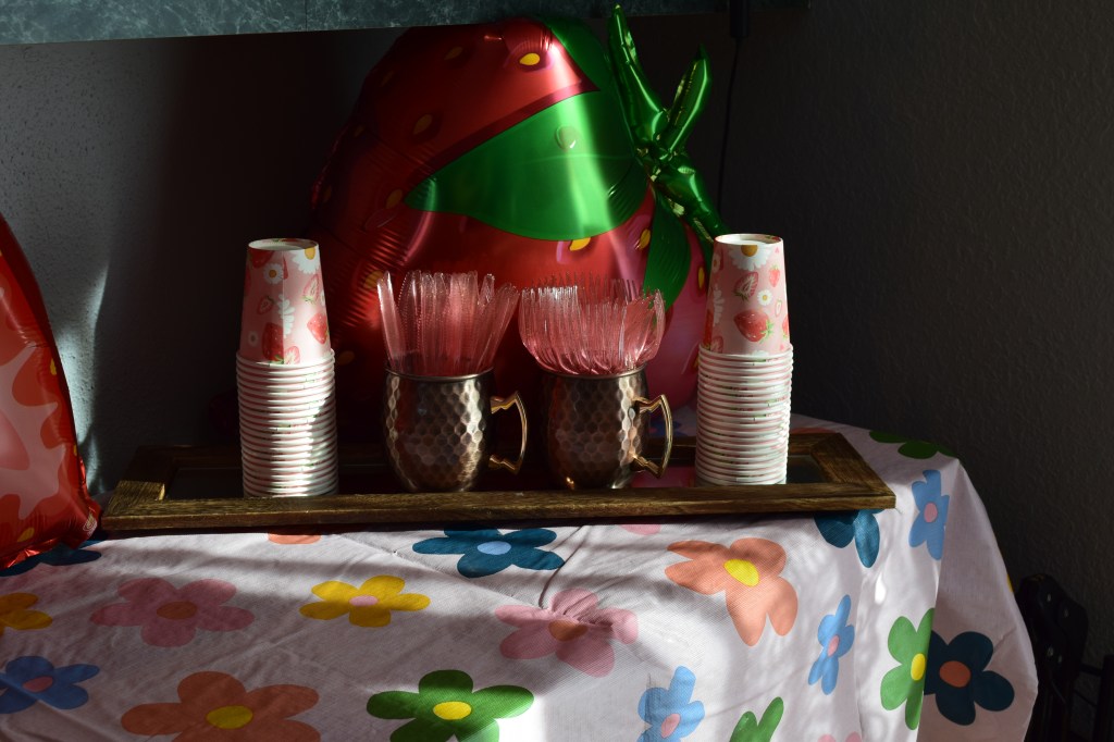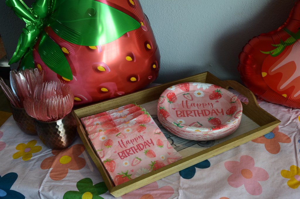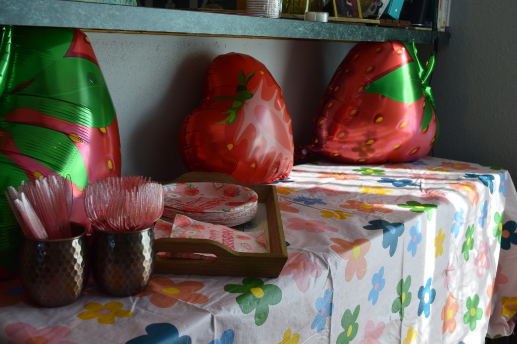 For this party, we just bought a few decoration packs and focused on a couple areas to decorate. The dining room and the entry. This limits stimulation (for me) and it makes for a quicker clean up time. The decorations we used this year were from Amazon. They had many choices. After sifting through the options, we chose a dainty strawberry and floral tableware set. We also chose a strawberry balloon set.