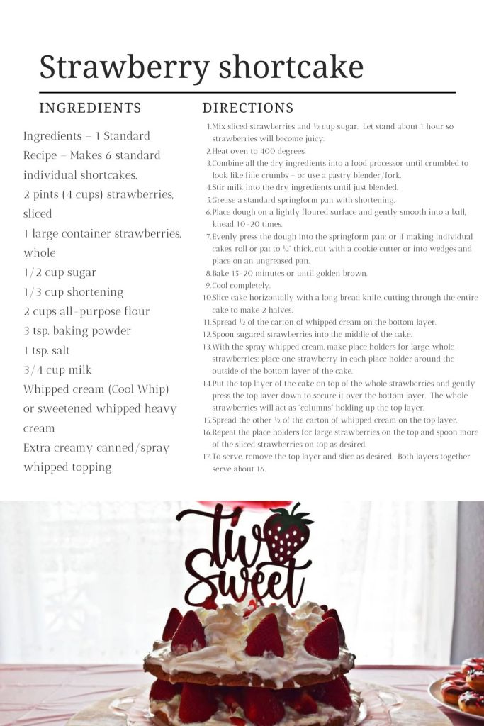If you want a light and tasty cake, then this shortcake is for you! It’s perfect for any holiday or gathering. You can use any filling, but we used strawberries and whipped cream for our two-sweet birthday party.